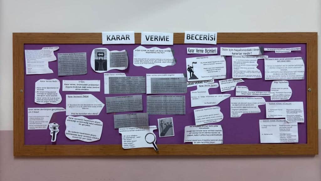 Okulumuzun özel hedefi olan karar verme becerisini konu alan pano, rehber öğretmenlerimiz tarafından hazırlandı.
